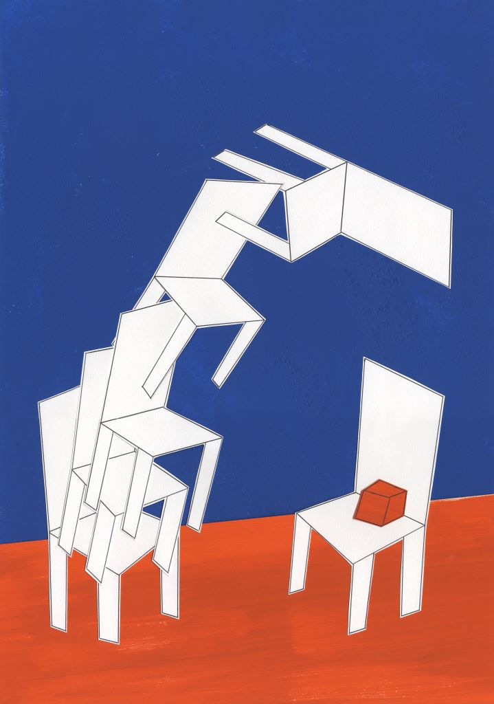 Il mix di immagini che si crea, viene elaborato e messo in discussione, perché Pantalone ha due menti. Dopo processi di revisione e rifinitura degli elementi, giunge alla sintesi. Un risultato dal tono minimale.